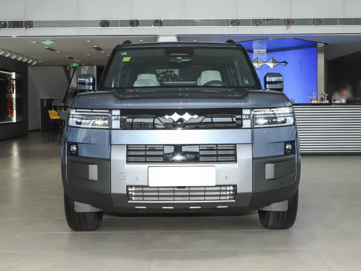 我们首先来看新车的外观设计方面,方程豹钛7的车头设计,完美诠释了“外刚内智”的设计哲学,将硬派力量感与新能源科技感巧妙融合。整车以方正轮廓为基础,前脸采用窄条幅式封闭格栅,弱化了传统燃油车的厚重感,更贴合新能源车型的简约调性。核心亮点在于分层式“双眼皮”大灯组,上层为纤细锐利的双L型LED日行灯,点亮后如同猎豹双眼,辨识度拉满;下层大灯与黑色饰板无缝衔接,搭配银色H型装饰分割的矩形进气口,既保障了散热需求,又为硬朗前脸注入精致细节。