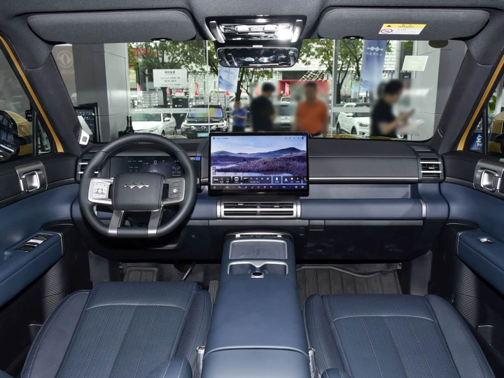 再来看车身侧面部分,车身侧面是钛7“方盒子”造型的核心展现,4999mm的车长、1995mm的车宽与1865mm的车高,搭配2920mm的超长轴距,既营造出媲美硬派越野车的强大气场,又为车内空间奠定了扎实基础。平直的车顶线条贯穿全车,最大程度保留了头部空间,而垂直的车身侧面与利落的折线,让整车轮廓清晰分明,力量感十足。细节设计上,外凸轮拱搭配独特轮毂,强化了硬派越野风格;A柱至D柱的黑化处理的悬浮式车顶,为整车增添了时尚气息。车身侧面的C柱与D柱之间采用半封闭车窗设计,搭配侧裙护板,既优化了通过性,又提升了视觉张力。