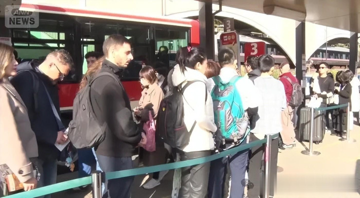 巴士站排队、电车月台拥挤、车站前商店街挤满游客,前往热门景点大涌谷的道路更是大堵车。三连休首日的箱根,到处都人山人海。其中,箱根美术馆内的绝景茶室排起最长达一小时的队伍。馆内约400株枫树呈现大红斑斓的壮丽景色,让游客们惊叹不已。