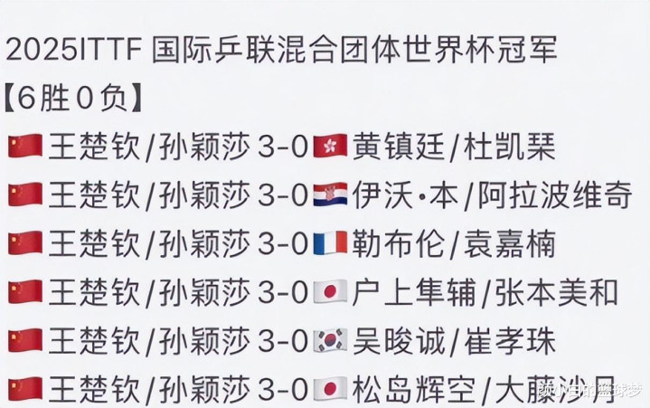 本次混团世界杯,王楚钦/孙颖莎两人只要搭档就是拿3分,六场比赛无一败绩,日乒换了两次组合都没有从这两人手中拿到任何的1分。